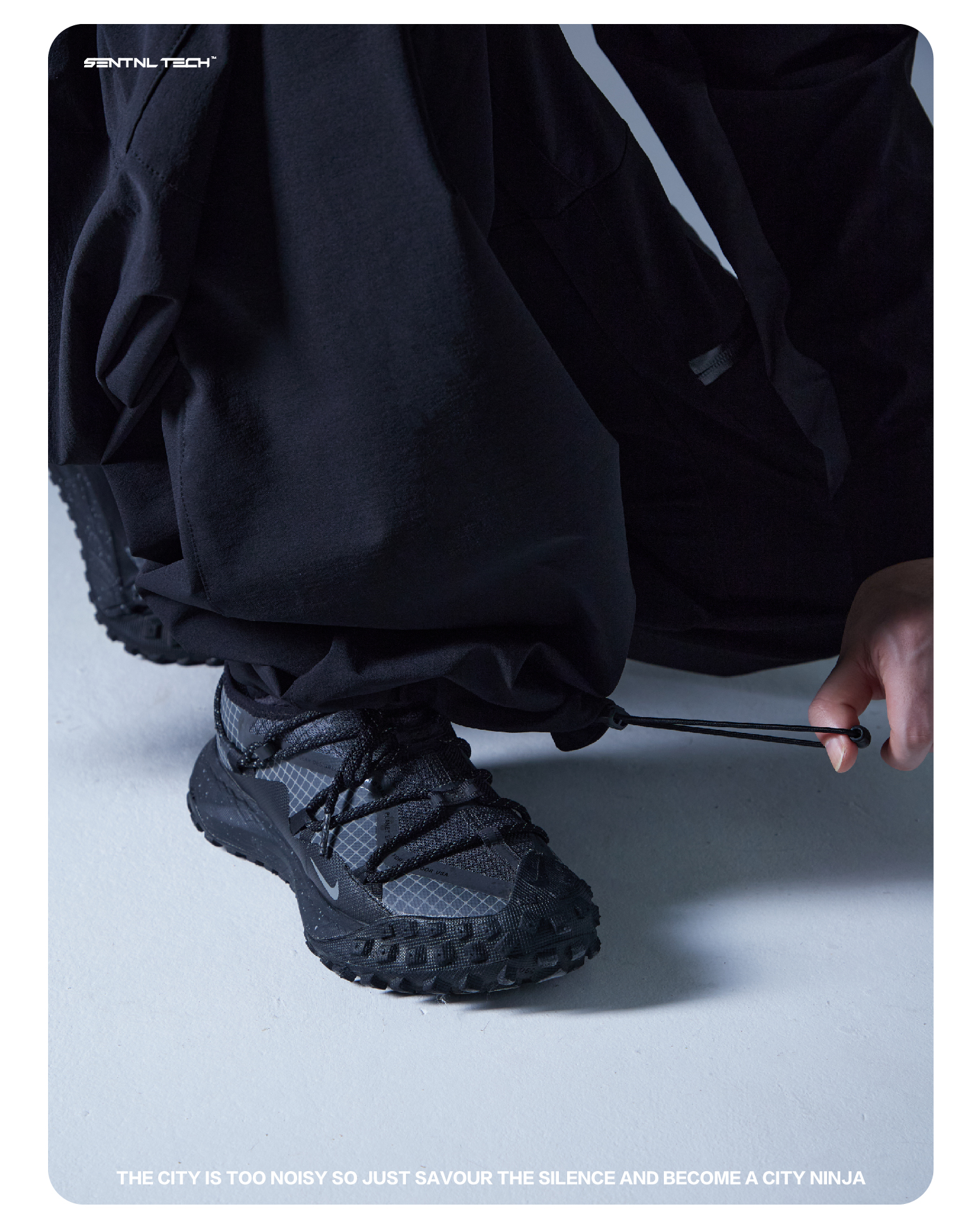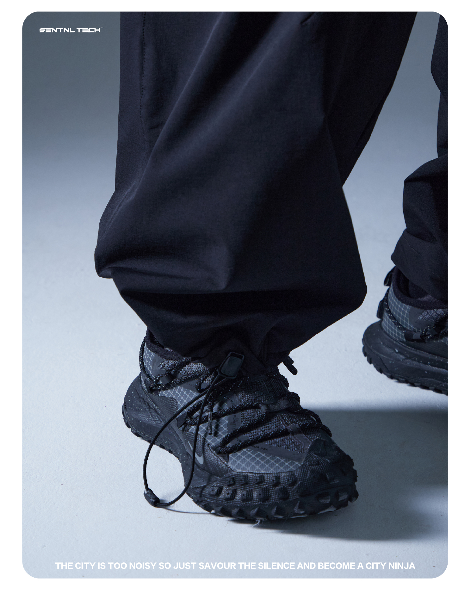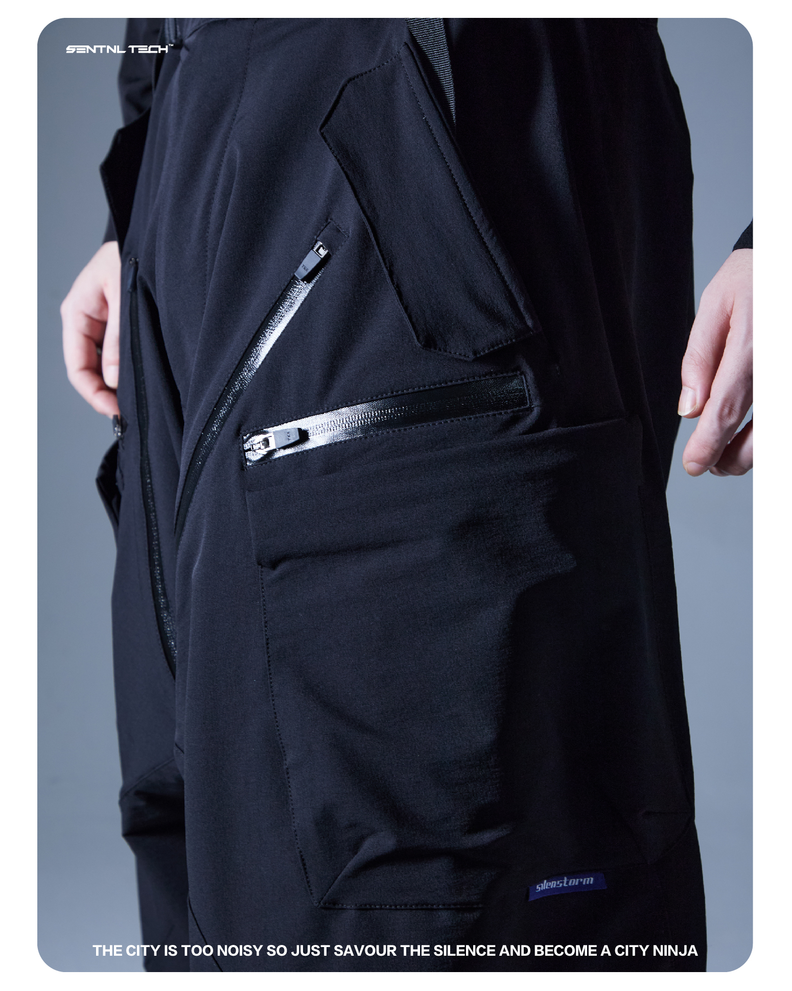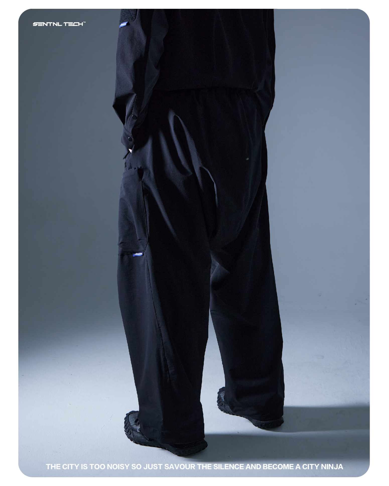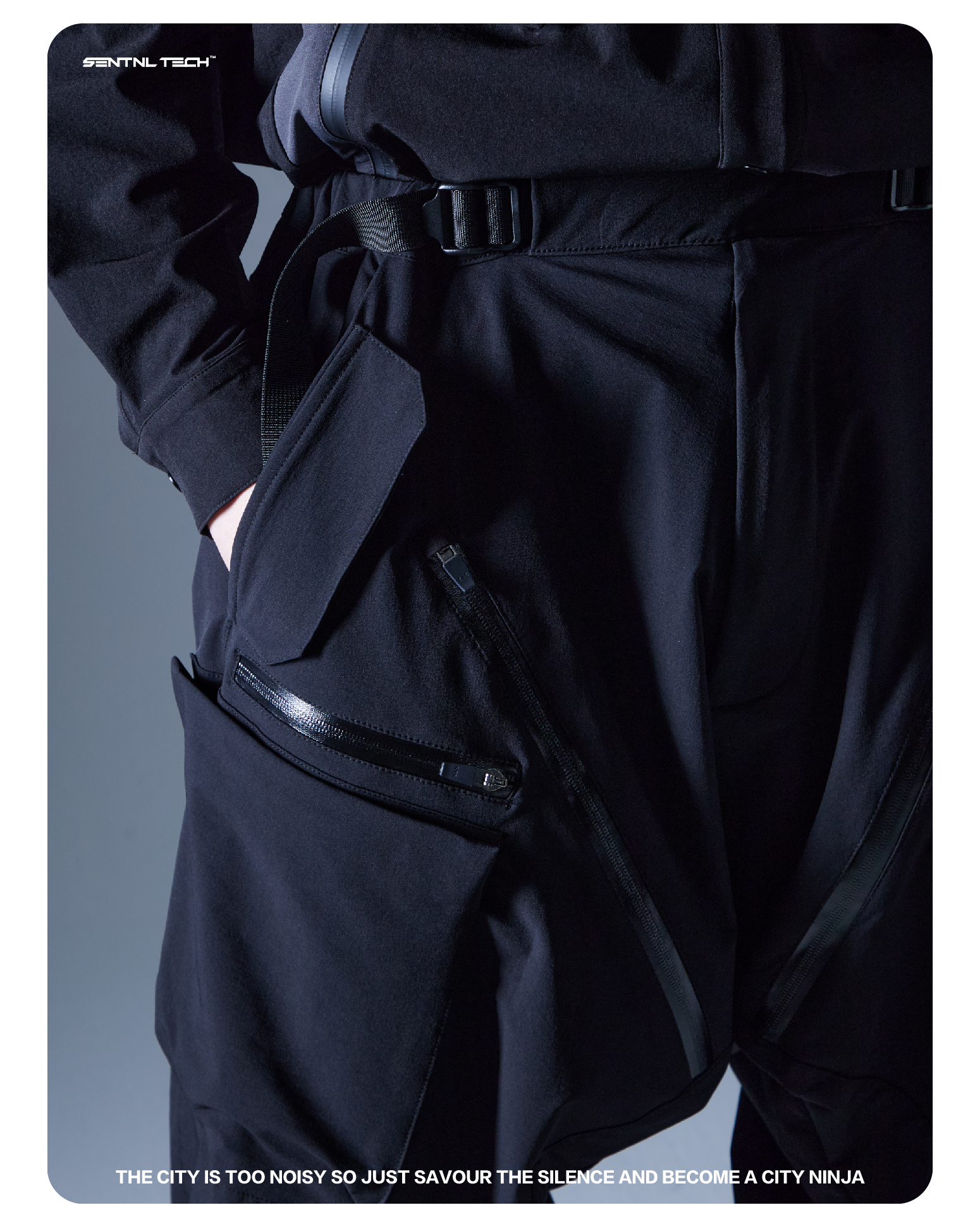 - These drop-crotch pants are designed for full-body adaptability and optimal ventilation. Made from water-repellent brushed mountain fabric, they offer protection against light splashes while maintaining comfort. The ventilation system features black breathable mesh on the inner side of the zippers, allowing natural air exchange during movement, with an air permeability of 297mm/s.