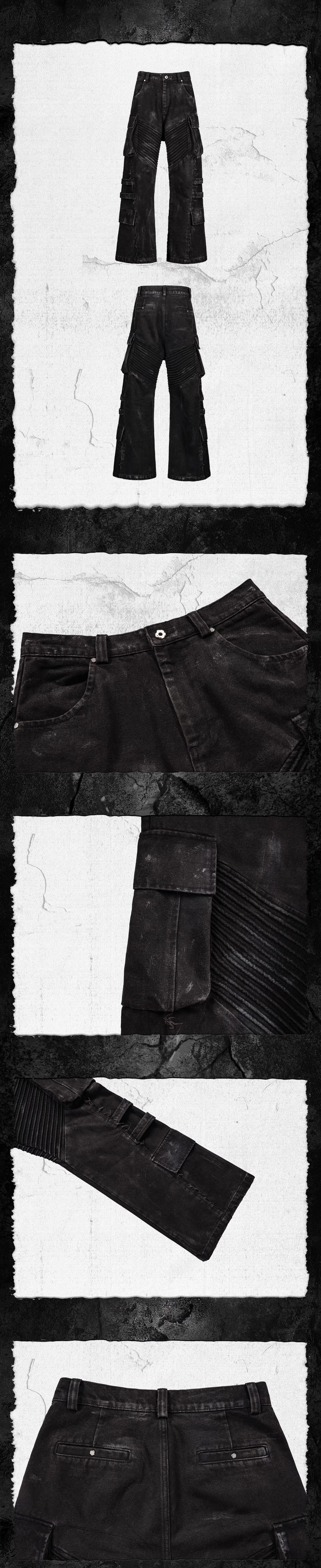 - These denim pants feature a relaxed flared silhouette, seamlessly blending functionality with wasteland aesthetics. The large side pockets and distressed strap details enhance their rugged practicality, while moto-style pleats inject a sense of power and speed. A unique rust-stained, mottled aging process mimics the marks left by time and sandstorms, ensuring each pair carries an irreplaceable character. Whether roaming through ruins or navigating urban streets, these pants serve as the perfect armor for rebellious souls.