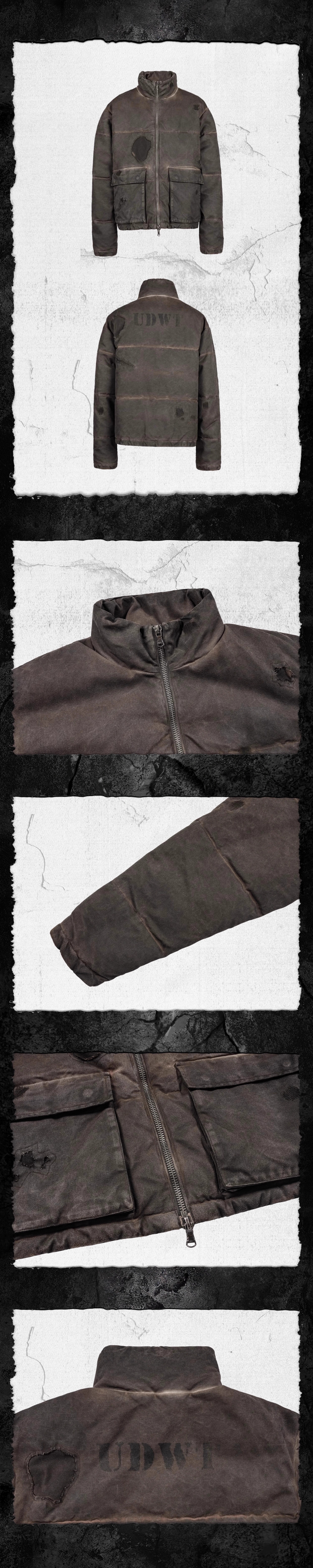 - Designed in a relaxed boxy fit, this padded jacket features a substantial 400g quilted cotton filling, offering the last refuge for wanderers traversing the desolate wastelands. A unique distressed dyeing process simulates the wear of time, while handcrafted abrasions across the garment evoke the remnants of a tribe weathered by the elements. Randomized embroidery stitches subtly embellish the rugged surface, adding layers of depth—like the silent imprints left behind by a lone traveler in the wild.