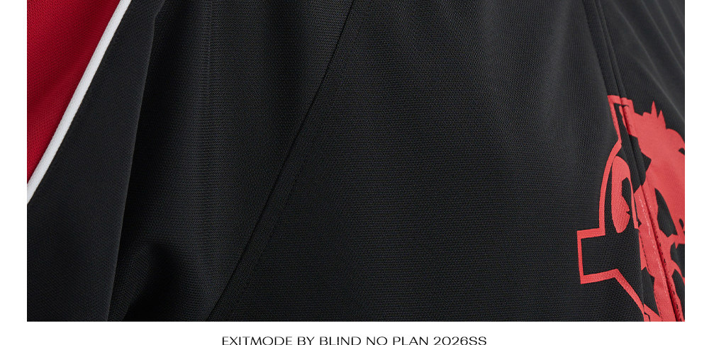 - This jacket features a cropped, wide fit with color-block paneling. The collar and hem are finished with a snug ribbed trim, and the body graphics are applied using screen printing.