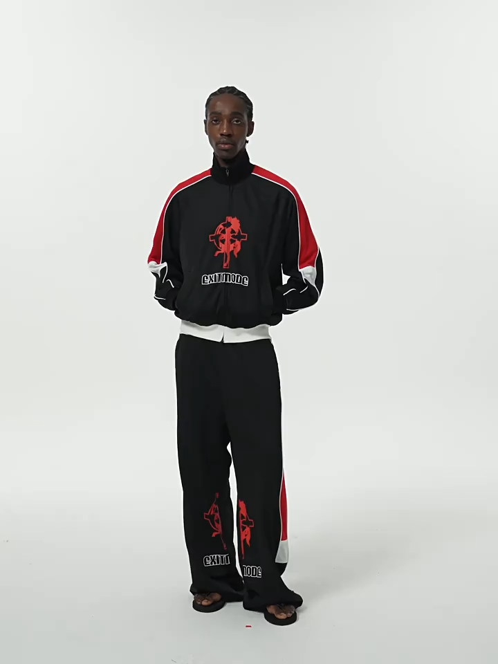 - Featuring a cropped, wide-leg fit with color-block paneling. The graphics are applied using screen printing.