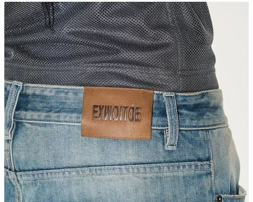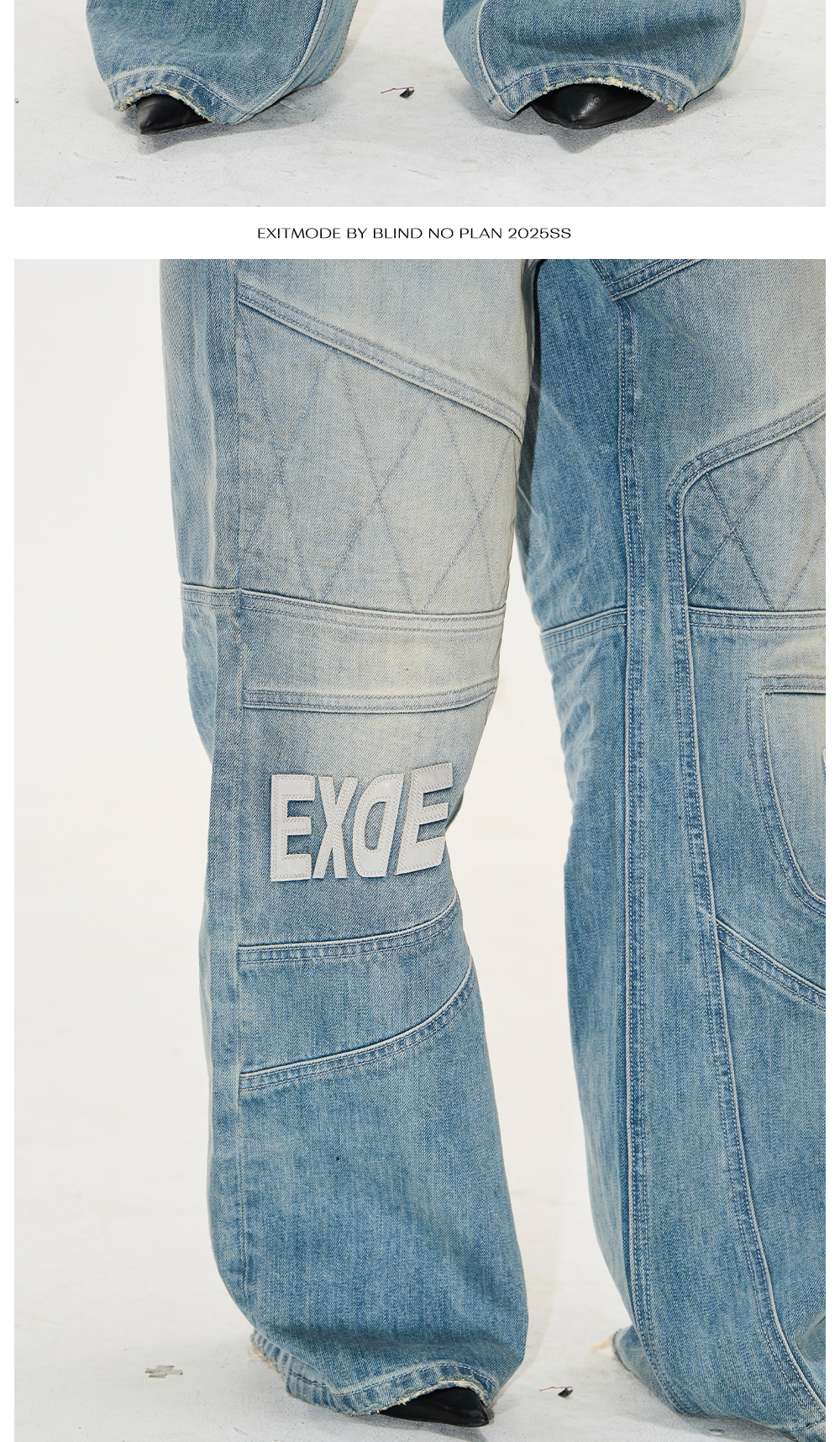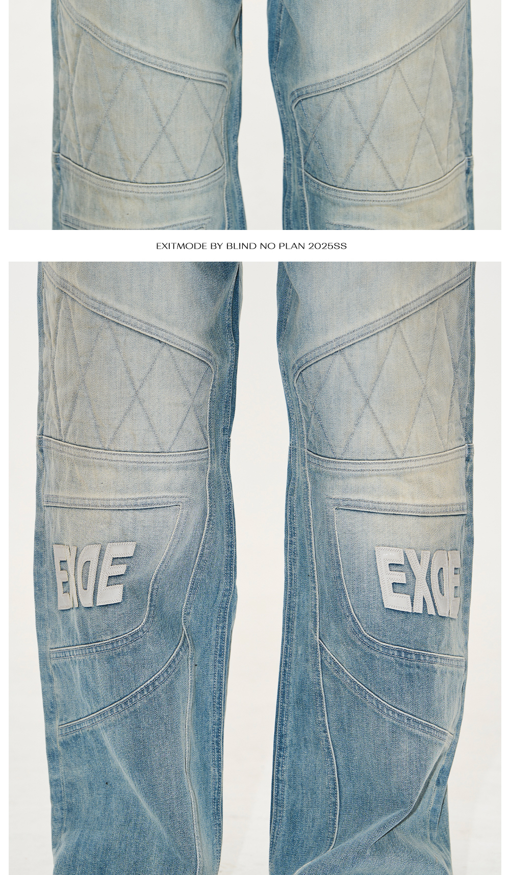 Design Details: These pants blend moto aesthetics with denim, featuring quilted padding for a structured look. Patchwork leather embroidery enhances the design, while a vintage washed effect adds depth. Subtle distressing on the pockets and hem further refines the rugged appeal.