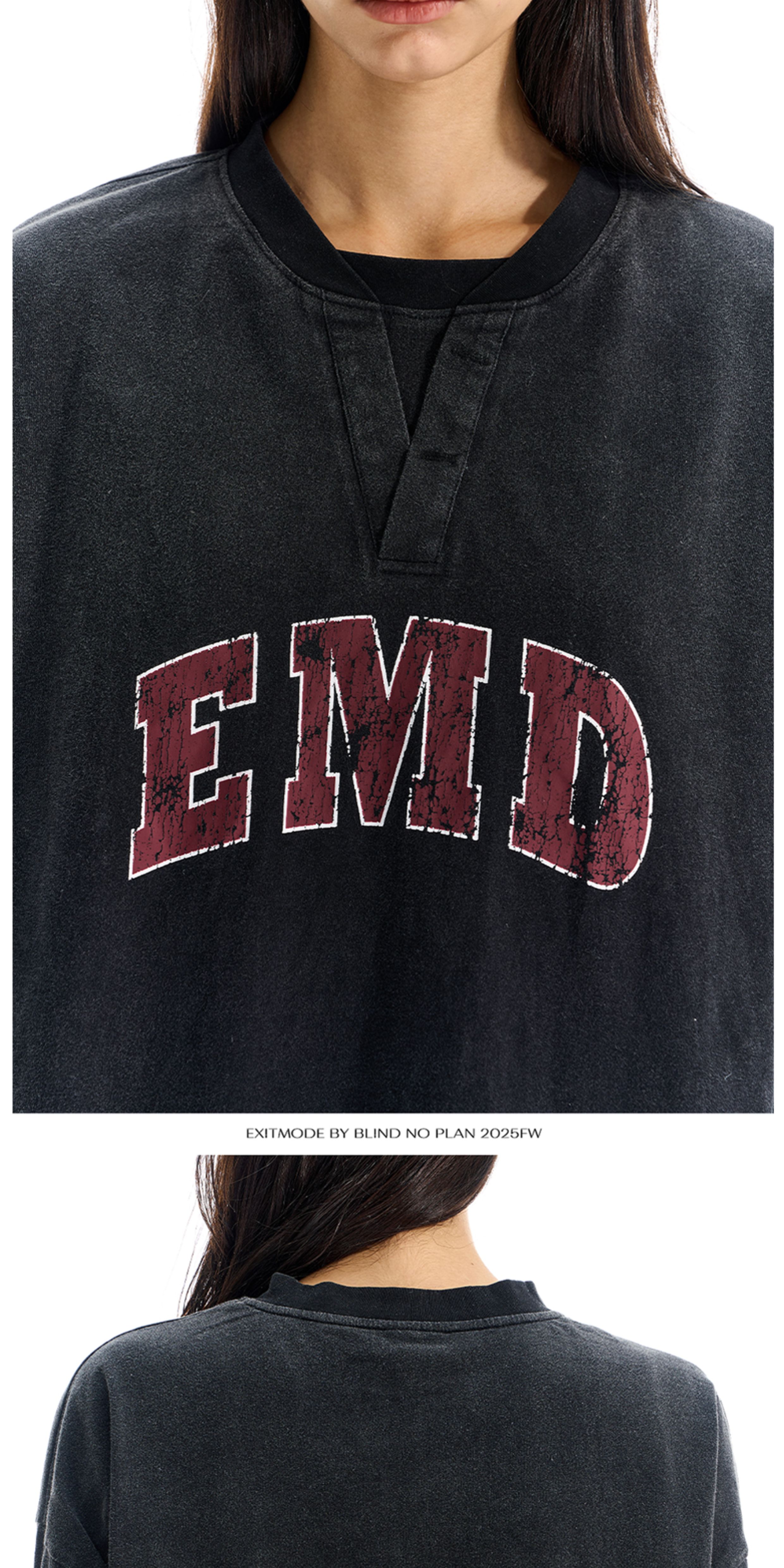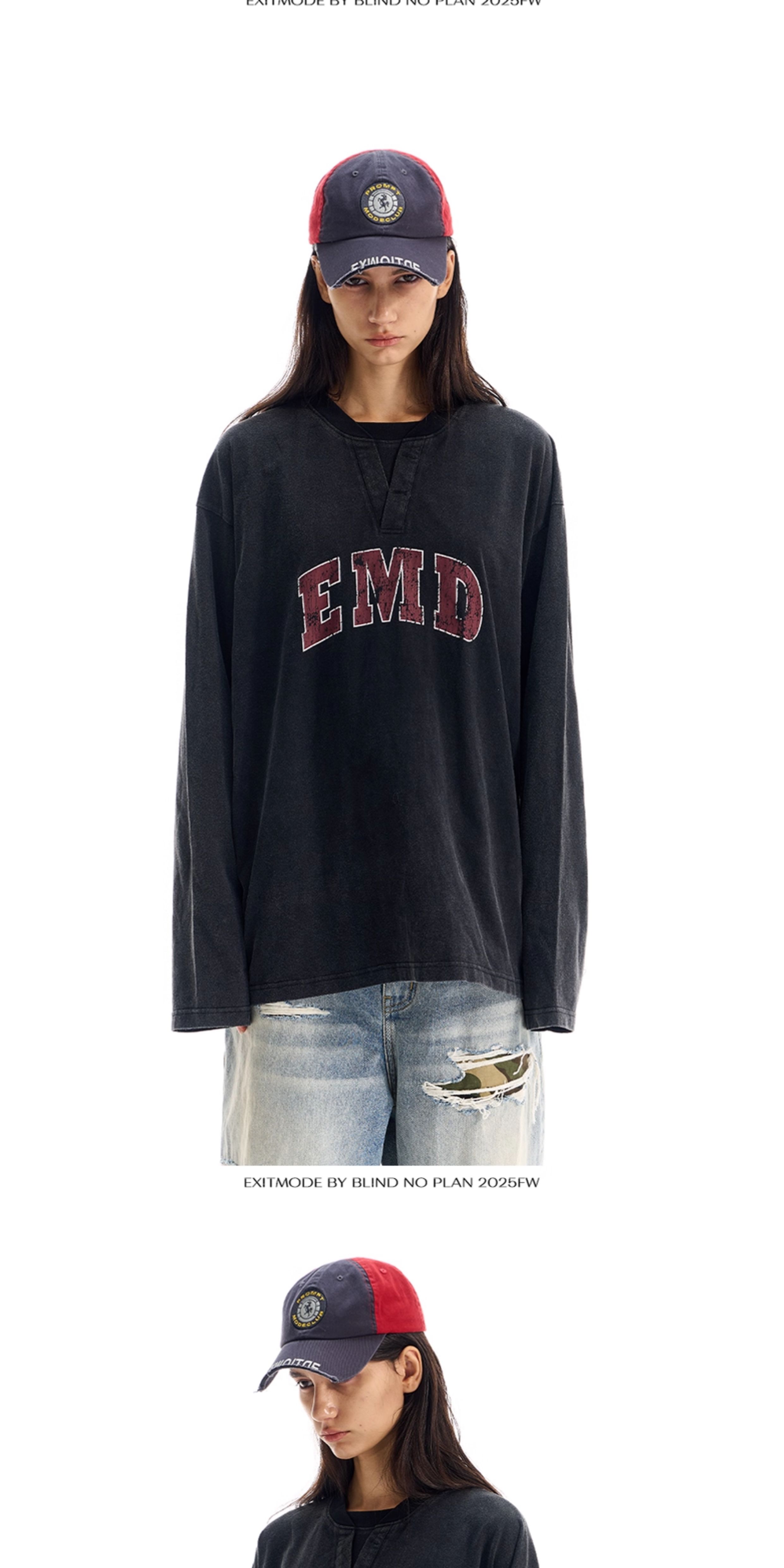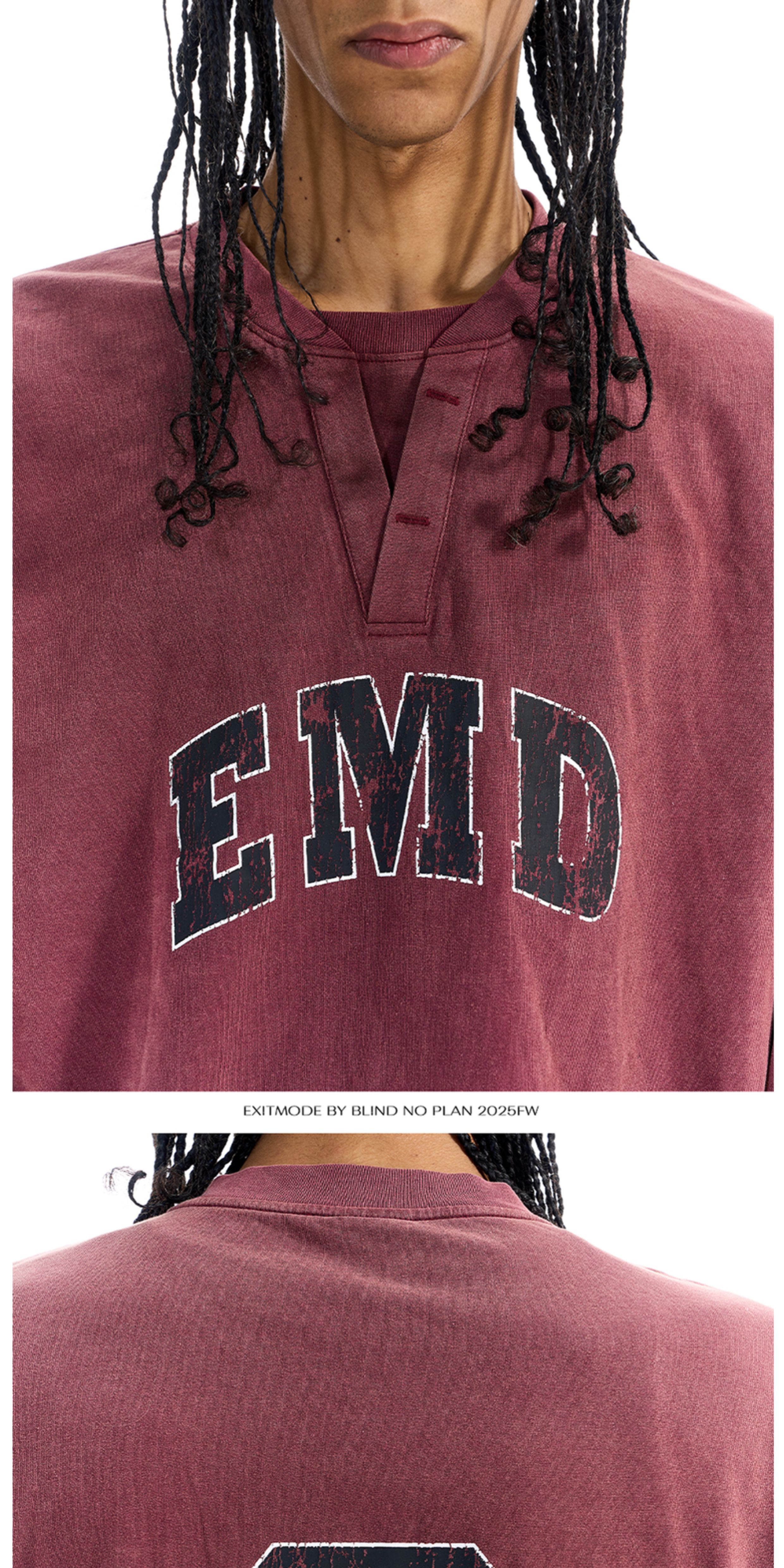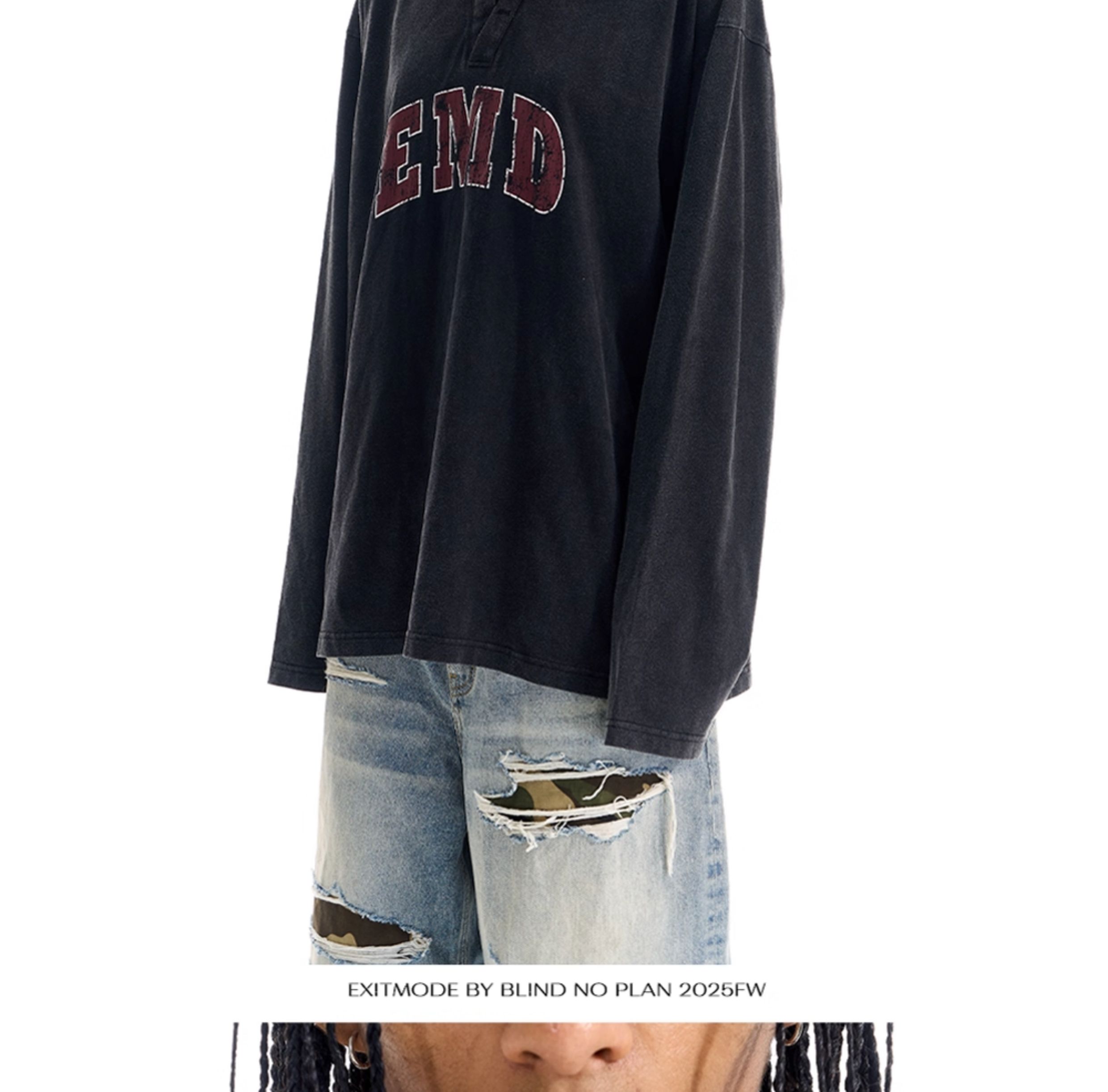 - Crafted in a relaxed fit, this long sleeve tee features a faux double-collar design that adds depth to the neckline. The front graphic is created with screen-printing, while the garment undergoes a washed distressed treatment to enhance texture and vintage character.