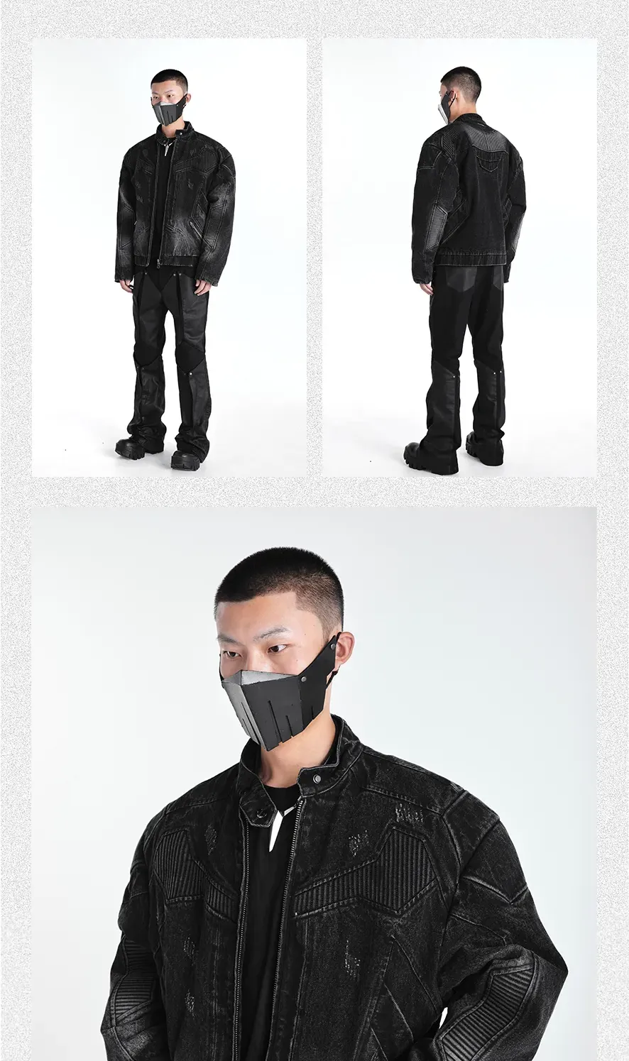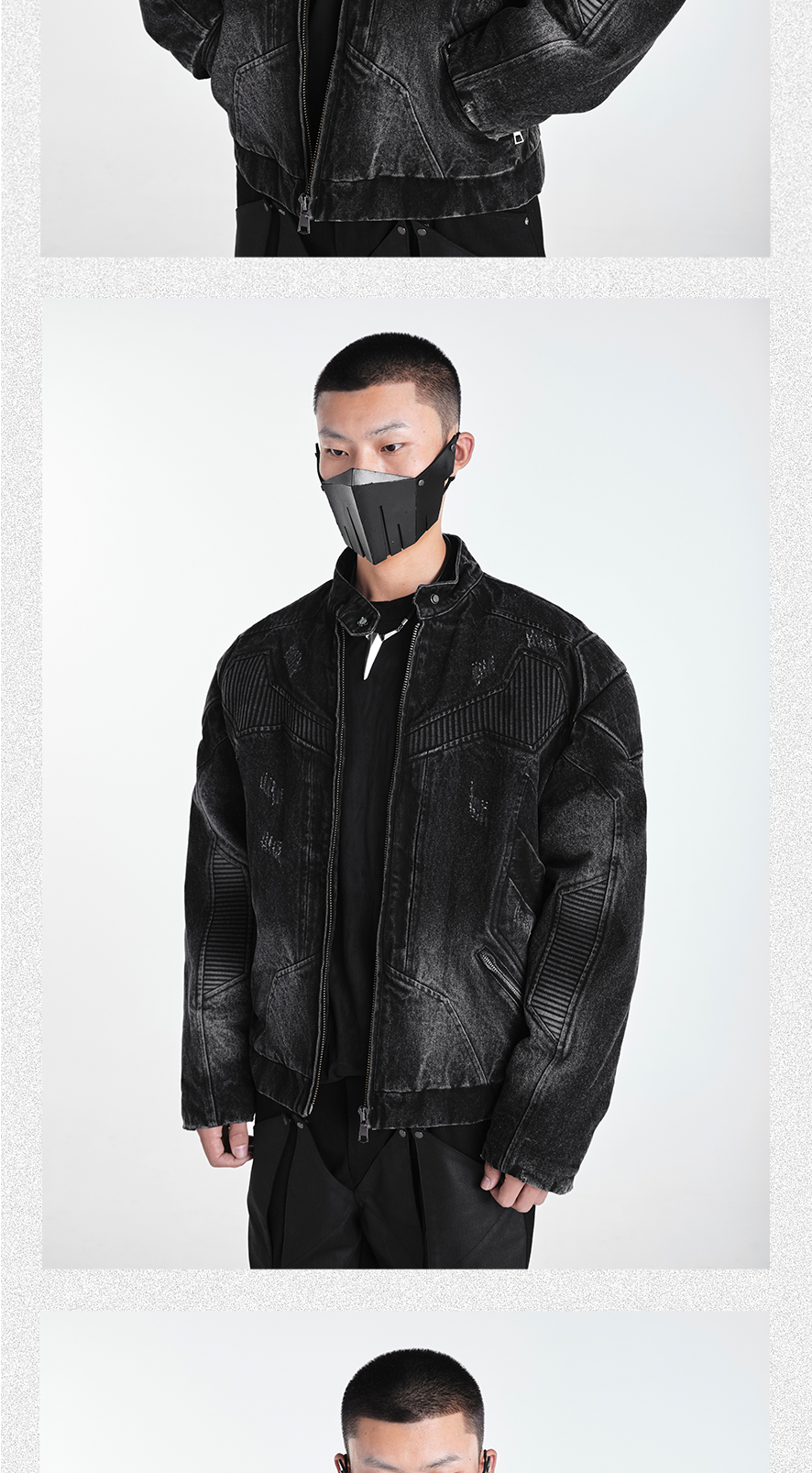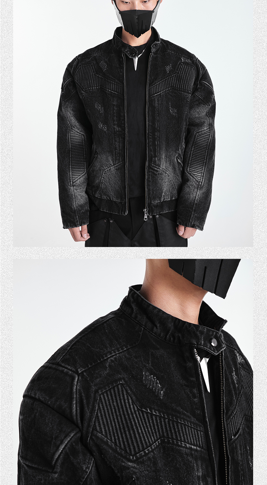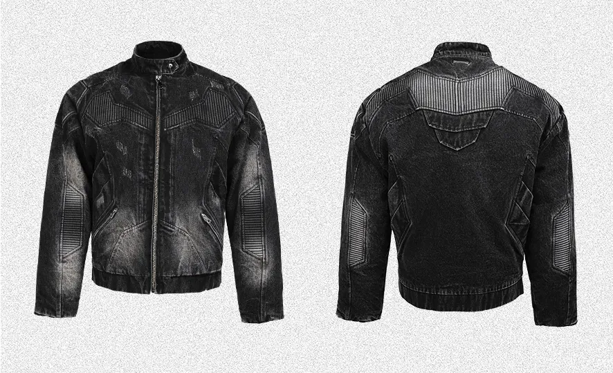 - This statement denim jacket features a washed gradient finish combined with distressed and pleated craftsmanship to create a richly layered texture. The heavy quilted structure provides both form and warmth, while panelled stitching and intentional damage details enhance its rugged aesthetic. Finished with custom metal accessories throughout, it delivers a strong sense of brand identity and dark, avant-garde street appeal.
