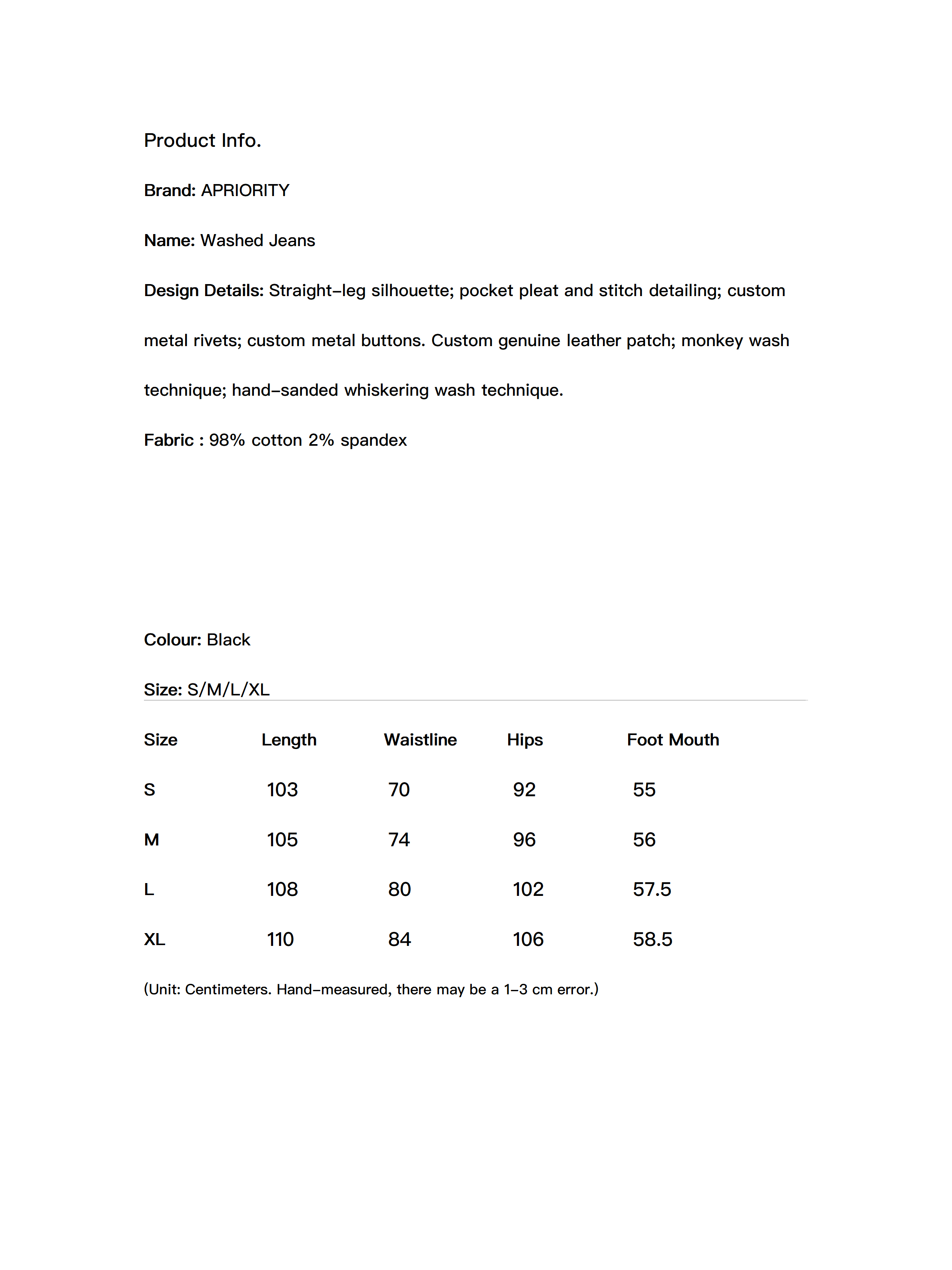 Straight-leg silhouette; pocket pleat and stitch detailing; custom metal rivets; custom metal buttons. Custom genuine leather patch; monkey wash technique; hand-sanded whiskering wash technique.