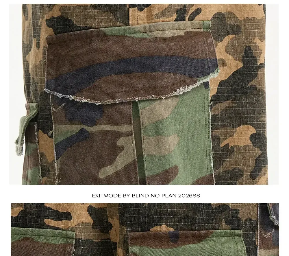 Design Details: Featuring a bootcut silhouette with two contrasting camouflage patterns in a color-block panel design. Raw-edge detailing on patch pockets and panel seams, finished with an all-over garment-washed and worn look for added visual depth.