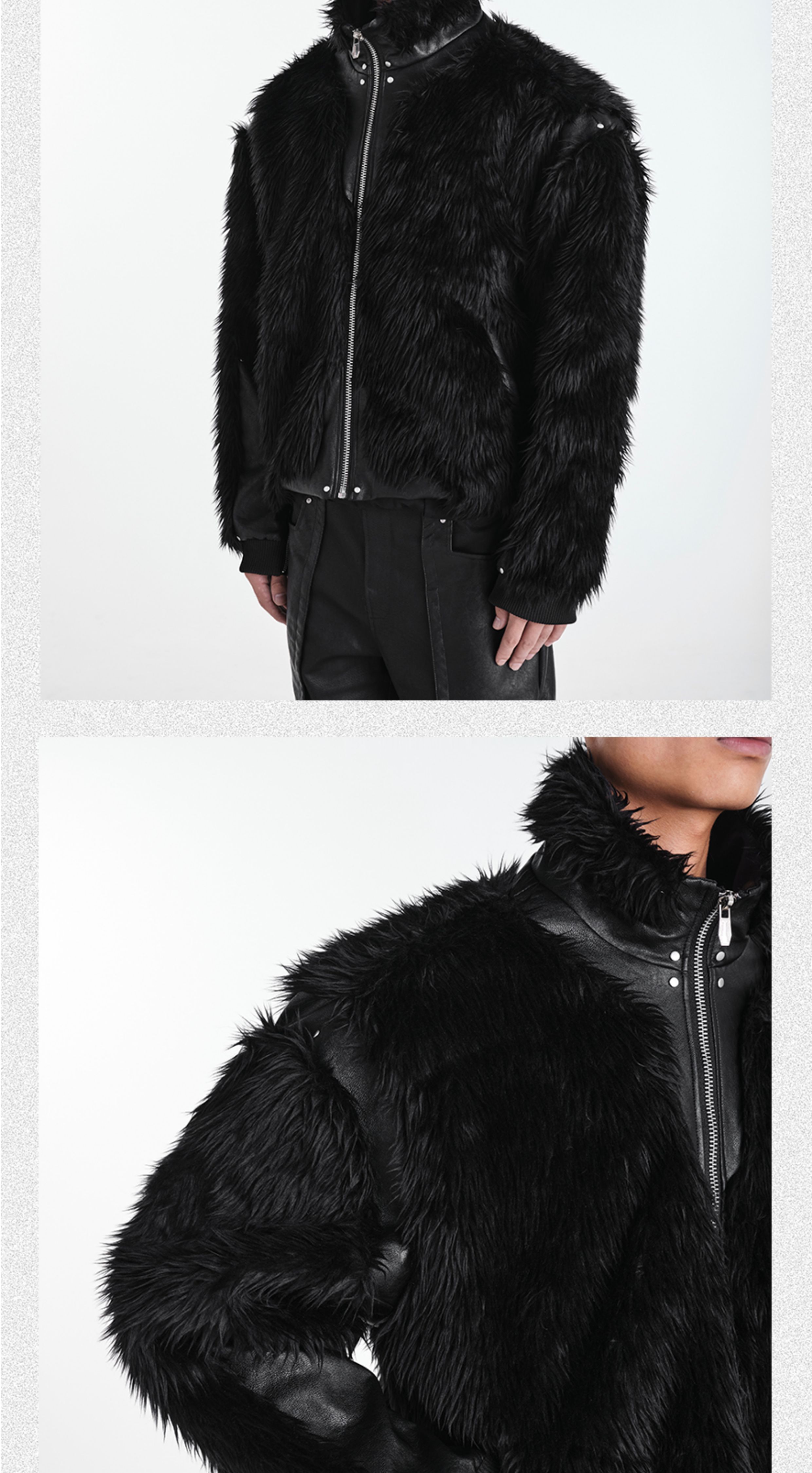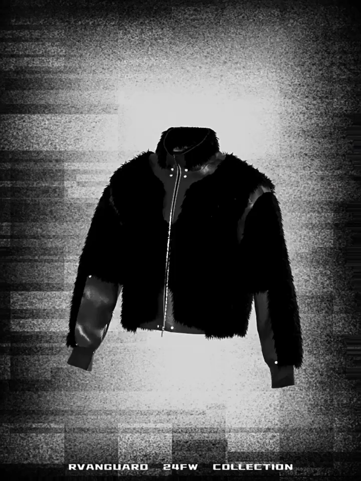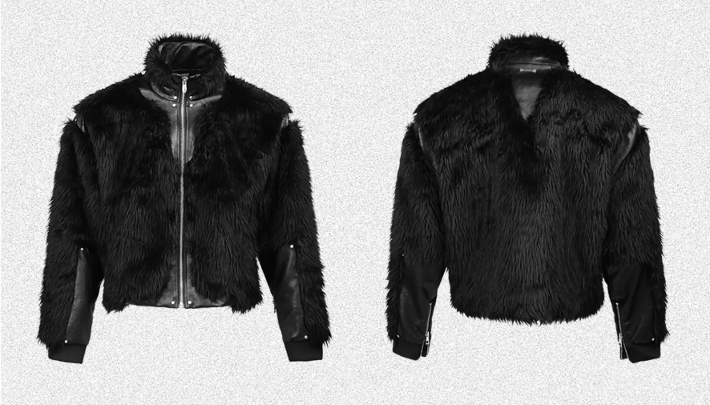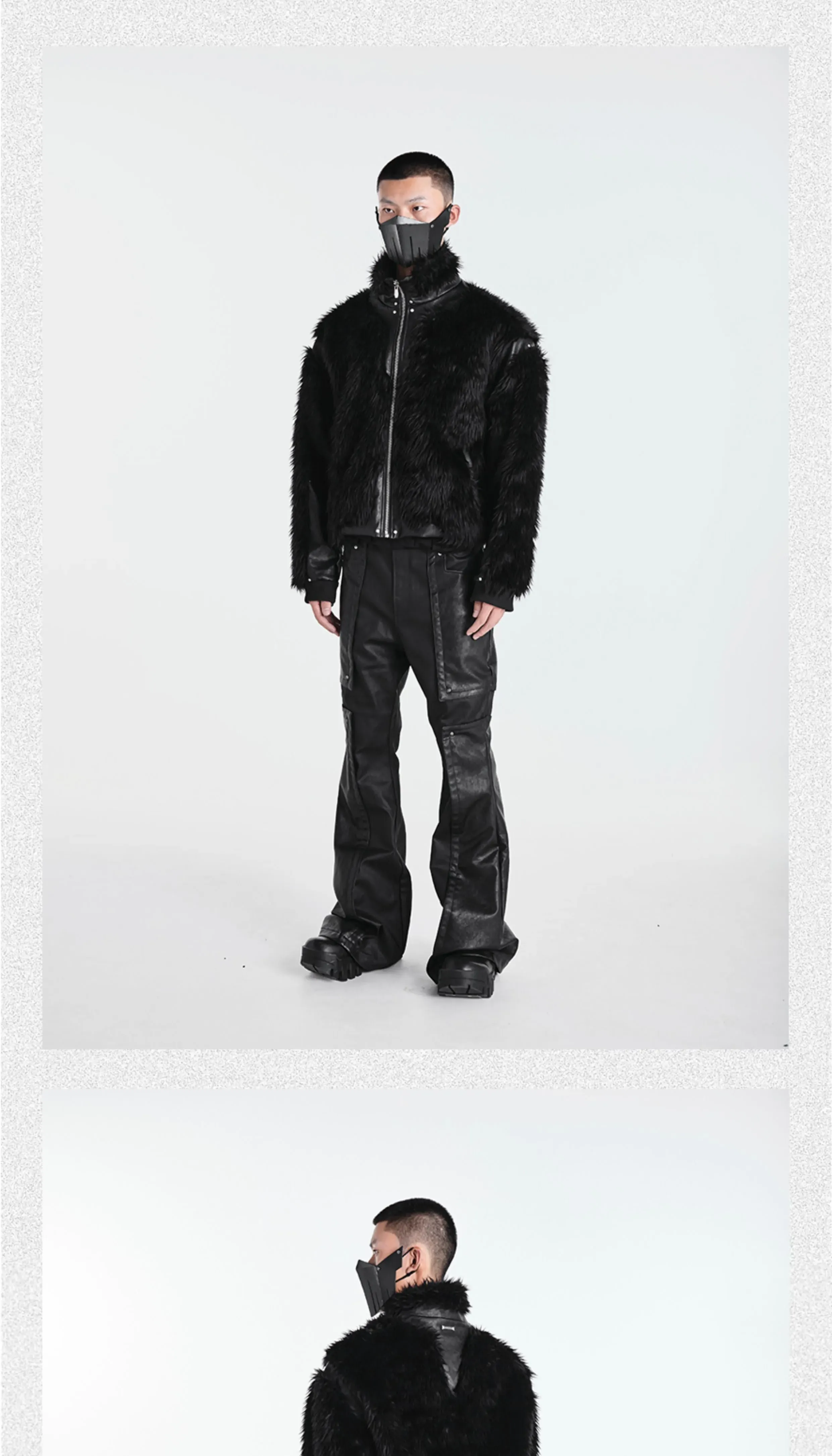 - This jacket features a waterfall wool and leather panel construction, blending contrasting textures to amplify its dark, avant-garde aesthetic. Detailed with metal rivet embellishments and a custom metal backplate, it showcases refined craftsmanship and brand identity. The padded interior ensures warmth and comfort while maintaining a structured silhouette, making it both functional and stylish.