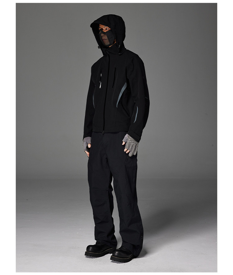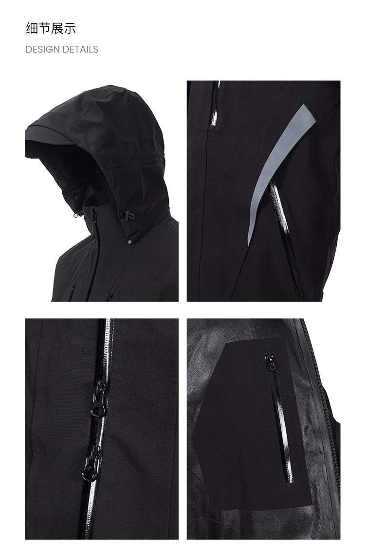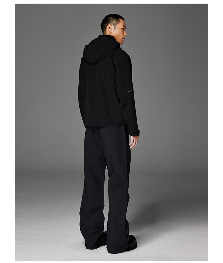 - The jacket employs full seam taping internally, with waterproof tape heat-sealed over all seam junctions to completely seal stitch needle holes against rain ingress, significantly enhancing waterproof performance. The attached hood with an adjustable drawcord fits snugly around the head. Paired with a high collar design, it blocks wind and rain. The 3D-cut brim sheds water without obstructing vision. Reflective silver-gray strips on the sides and hem improve nighttime visibility.