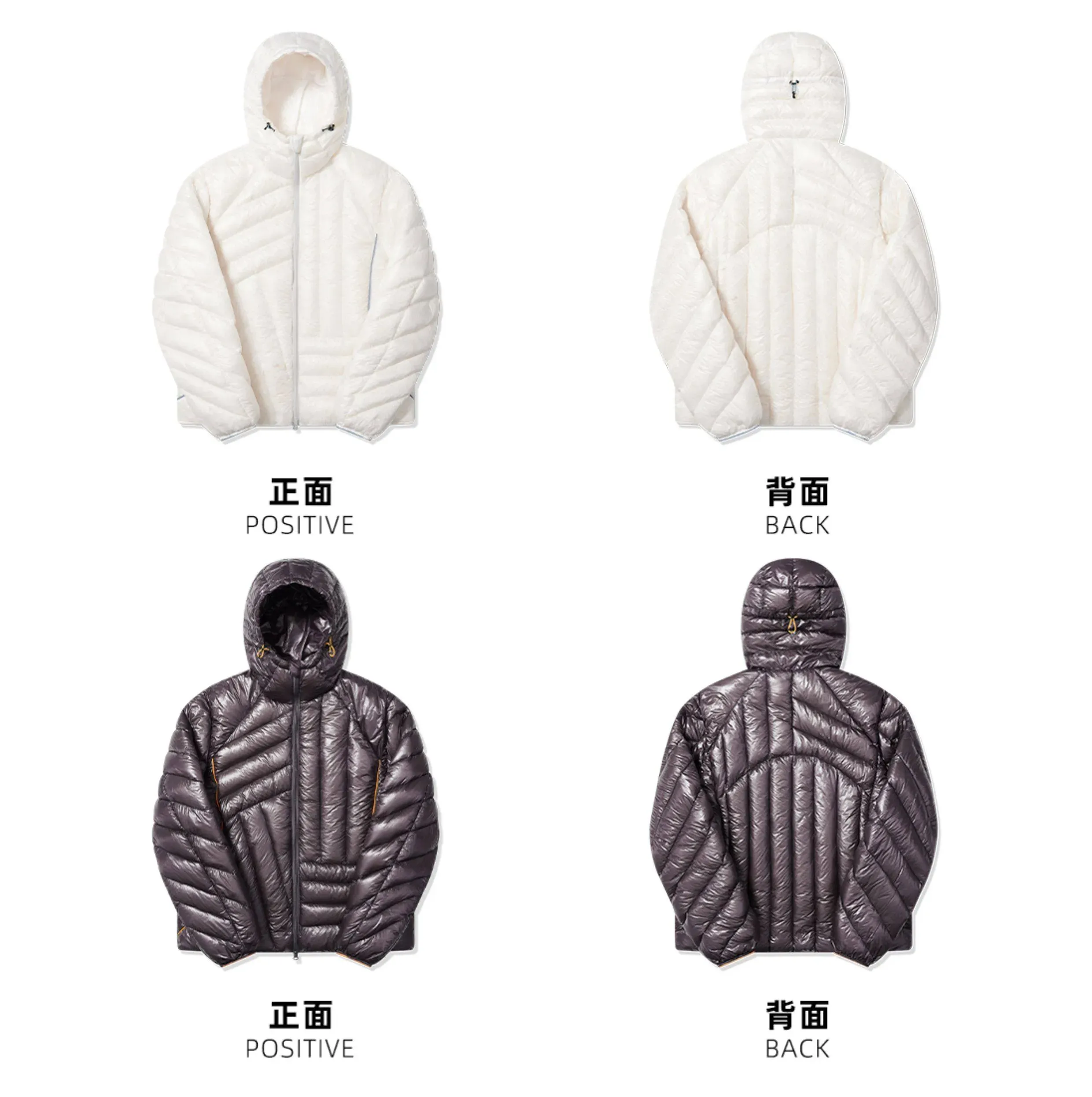 Crafted from ultra-lightweight 10D fabric with a fine, semi-sheer check texture. Treated for water repellency and high wind resistance, it handles light rain and chilly conditions for carefree autumn and winter outings. The baffle-down jacket features a tailored fit, making it suitable as a mid-layer. This piece innovatively combines horizontal, vertical, and diagonal quilt lines across asymmetrically pieced panels, redefining the down jacket's appearance with added visual depth and standout style. Contrast piping along the cuffs and side seams introduces vibrant accents. The hooded design enhances overall warmth and aesthetic appeal. A hidden placket, along with adjustable drawcords integrated into the hood opening and hem, allows a secure, draft-free fit. The two-way zipper enables versatile styling and easy layering as a mid-piece.
