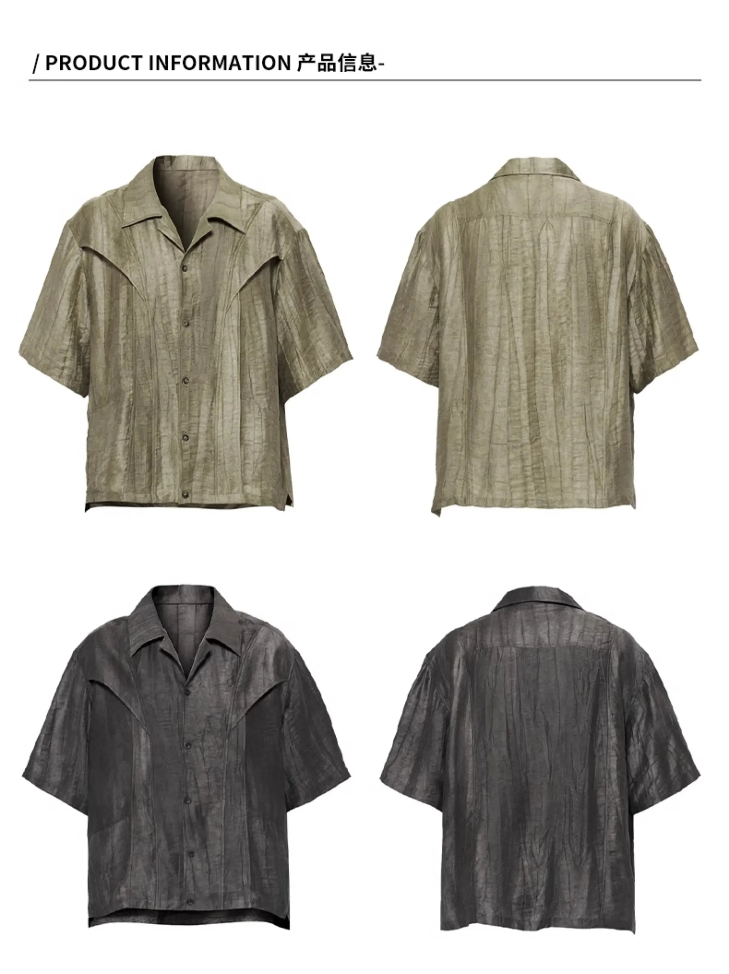 - Inspired by dried foliage, this shirt is crafted from a blend of Tencel and nylon, featuring an inherent wrinkled texture that is breathable, cool, and exceptional in feel. We've employed a slightly relaxed fit that continues our signature double-panel design language, with a front-short, back-long hem for a superior wearing effect that creates excellent layering when paired with tees. Available in a vibrant withered leaf green and a sophisticated classic grey—a versatile staple for the hot summer.