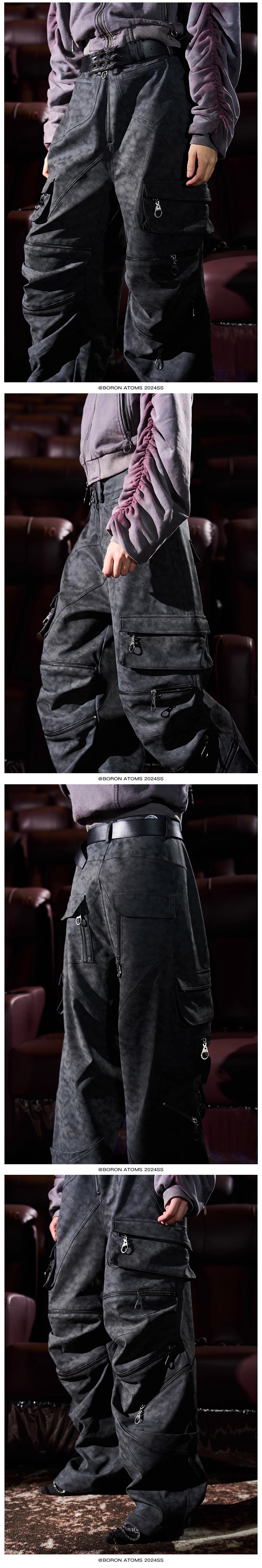 - The pants feature a three-dimensional cut, with dual zippers at the knees for adjustable shaping. Made from leather with a washed, cracked, and aged finish, they have a strong texture and are rich in details.