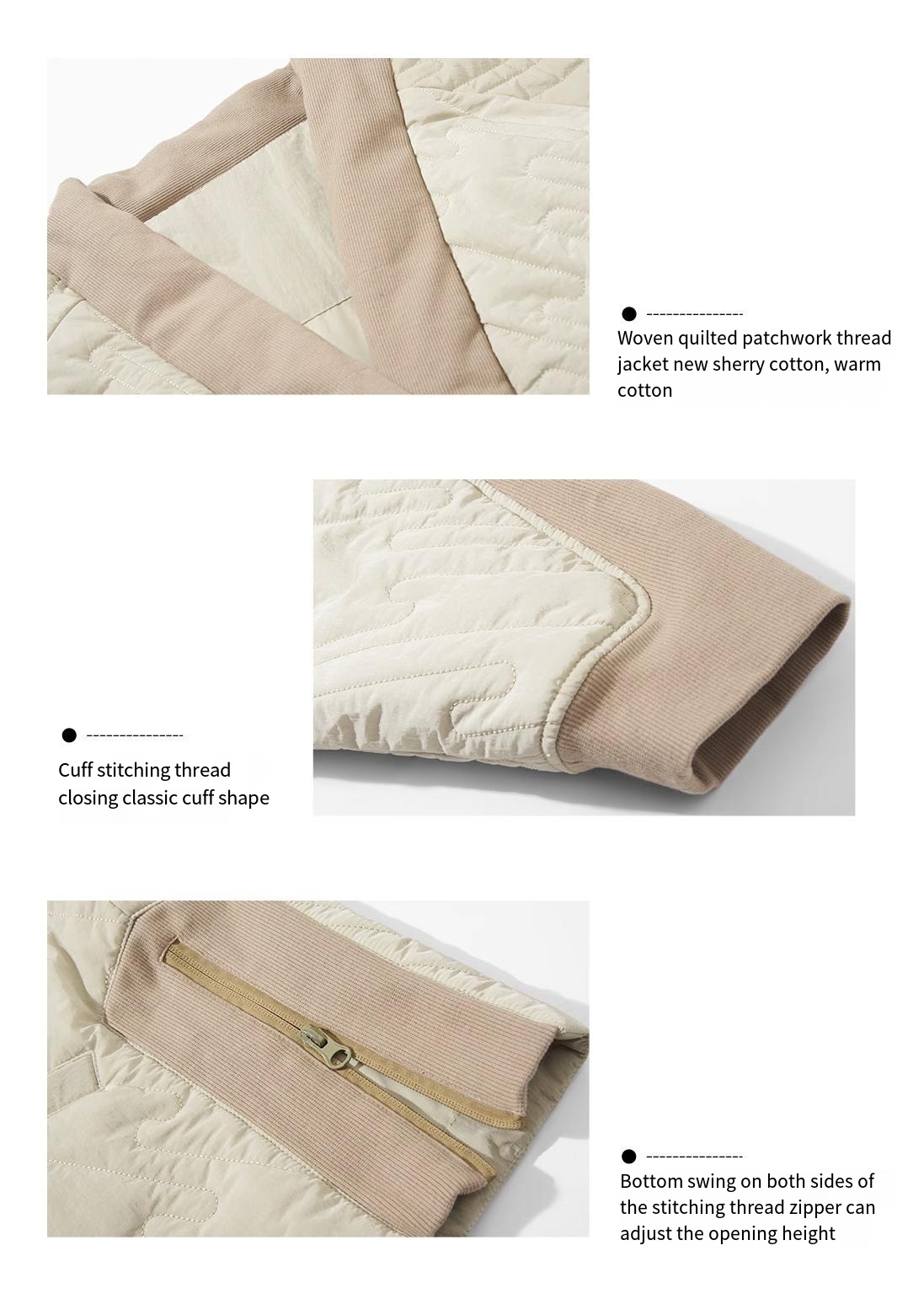 - Woven quilted patchwork threaded jacket with 150 grams of new sherry cotton inside to keep warm. Fabric with a small fine grain of wood texture, light luster. Cuff stitching thread closing, classic cuff shape, bottom swing on both sides stitching thread zipper, can adjust the opening height. Double splicing magnetic button flap, no trace and convenient.